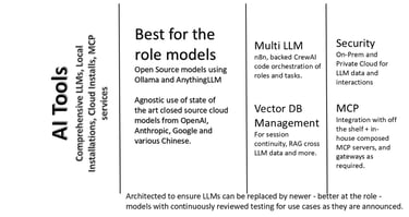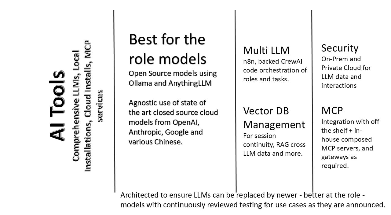 Significant experience with private LLMs services such as Ollama, AnythingLLM, CrewAI, n8n, Opencode, AWS Bedrock. Also with MCP services.